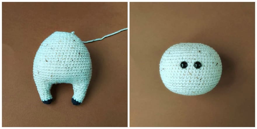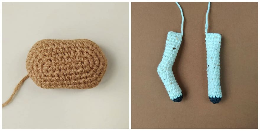 Beine, Körper werden in einem Stück gehäkelt. Der konvexe Teil ist Bauch.