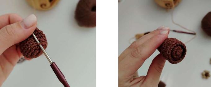 5 fM durch beide Maschenschlaufen häkeln und einen langen Faden zum Annähen lassen.