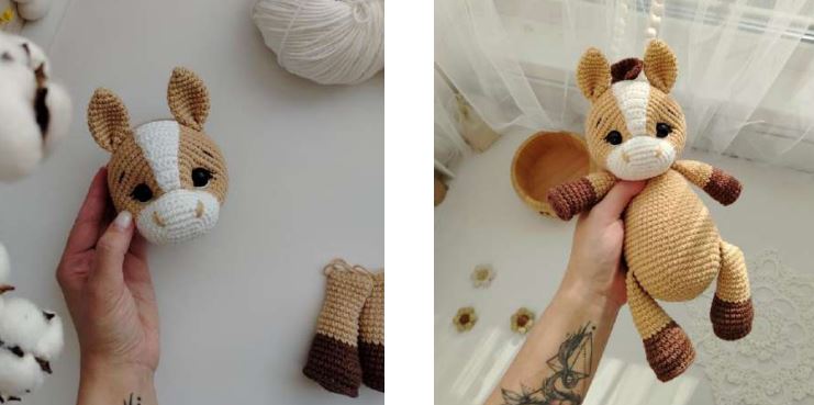Die anderen Teile des Spielzeugs haben hingegen eine sehr standardmäßige Struktur. Da das Spielzeug ohnehin aus Baumwollgarn gefertigt wird, sehen besonders die Ohren und die Mähne des Pferdes sehr schön aus. Ein weiteres Detail des Amigurumi-Spielzeugs ist der Latzhose, den es trägt. Wie man dieses Teil herstellt, werdet ihr im letzten Abschnitt der Anleitung erfahren.