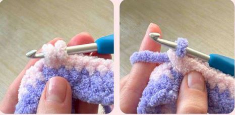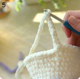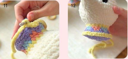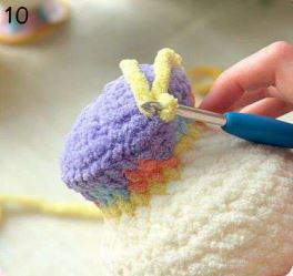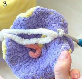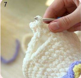 Zurück zu Rnd 9, cremeweißes Garn anfügen und in BLO häkeln (Bilder 3, 4):