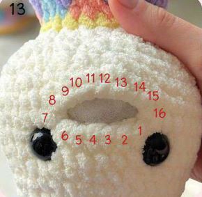 Setze die Sicherheitsaugen zwischen Runden 15 und 16 ein, sodass 5 sichtbare Maschen dazwischen bleiben. Platziere sie 1 Masche über der Nasenöffnung. (Bild 8)