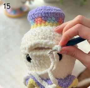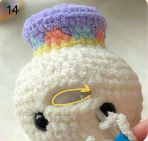 Gehe zurück zu Runde 17, wo du die Nasenöffnung gemacht hast (Bild 13). Cremeweißes Garn an der ersten übersprungenen Masche anfügen (Bild 14).