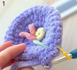 Die nächste Runde wird nur in den FLO gehäkelt. Nach dem Beenden der nächsten Runde musst du cremeweißes Garn in die BLO derselben Runde einfügen. Ich empfehle, einen Maschenmarkierer in die erste BLO zu setzen, um sie später leichter zu finden (Bild 1).