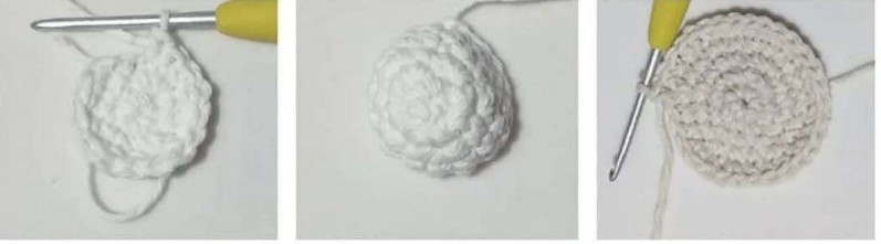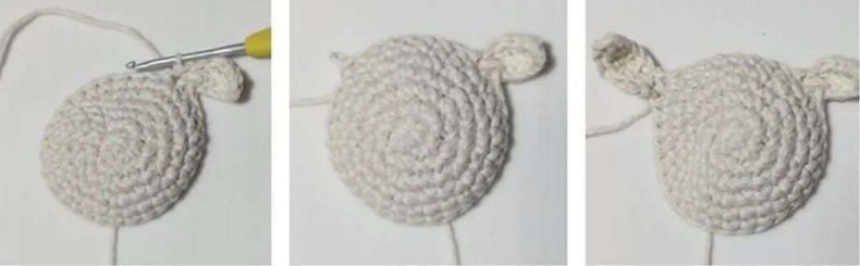 Runde 8) 1 fM in jede Grundmasche. (30) **Beim Vorbeigehen an den Ohren die hintere Schlaufe der Maschen 11 und 20 nehmen.