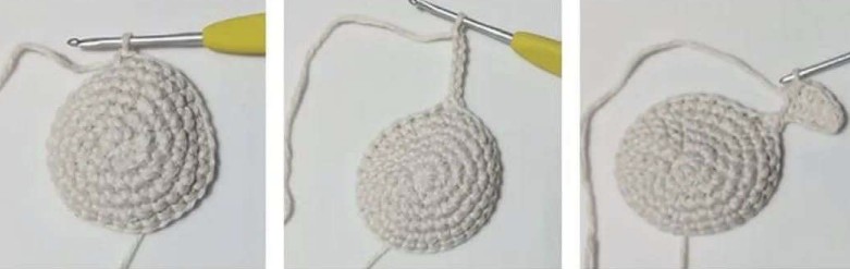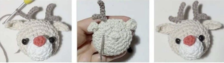 Eine einfachere Möglichkeit, das Geweih zu machen, besteht darin, eine Luftmaschenkette mit 10 Maschen separat zu häkeln. Mit Kettm zurückhäkeln. Faden abschneiden. Die Kette fast in der Mitte falten und am Kopf zusammennähen. Das zweimal machen.