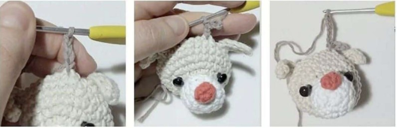 Die Schnauze zusammennähen und die Augen zwischen Runde 3 und 4 platzieren, mit 5 Maschen Abstand.