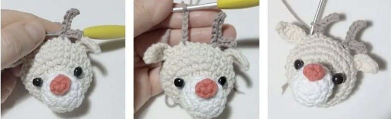 Mit dem Gesicht des kleinen Rehs zu dir gerichtet, die Häkelnadel 2 Maschen vom linken Ohr entfernt einführen und häkeln: 1 fM + 6 Lm. Ab der 2. Lm ab der Nadel häkeln: 5 Kettm. 4 Lm häkeln. Ab der 2. Lm ab der Nadel häkeln: 3 Kettm und mit 1 Kettm am Kopf beenden, damit das Geweih fest sitzt. Faden abschneiden und verstecken.