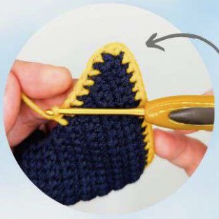 Garn in Senfgelb verwenden, die Häkelnadel mittig unten auf der Rückseite des Umhangs einstechen und entlang des gesamten Randes des Umhangs fM häkeln. Um die Ecken des Umhangs zu runden, an jedem Ende 1 zun machen.