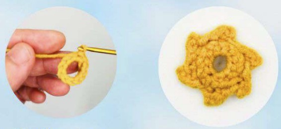 13 Lm häkeln, mit 1 Kettm in die erste Lm zum Ring schließen (darauf achten, dass sich die Kette nicht verdreht), 12 fM, (2 Lm, 1 fM in die zweite Lm, 1 Kettm in die nächste M, 1 Kettm) 6 mal wiederholen wiederholen, Faden abschneiden und vernähen.